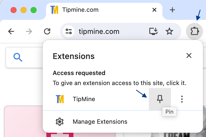 Before using the extension, make sure you are signed-in on the TipMine website. You can open TipMine by clicking the extension icon in the top right. If you do not see an icon, open the extensions menu and click on "Pin".